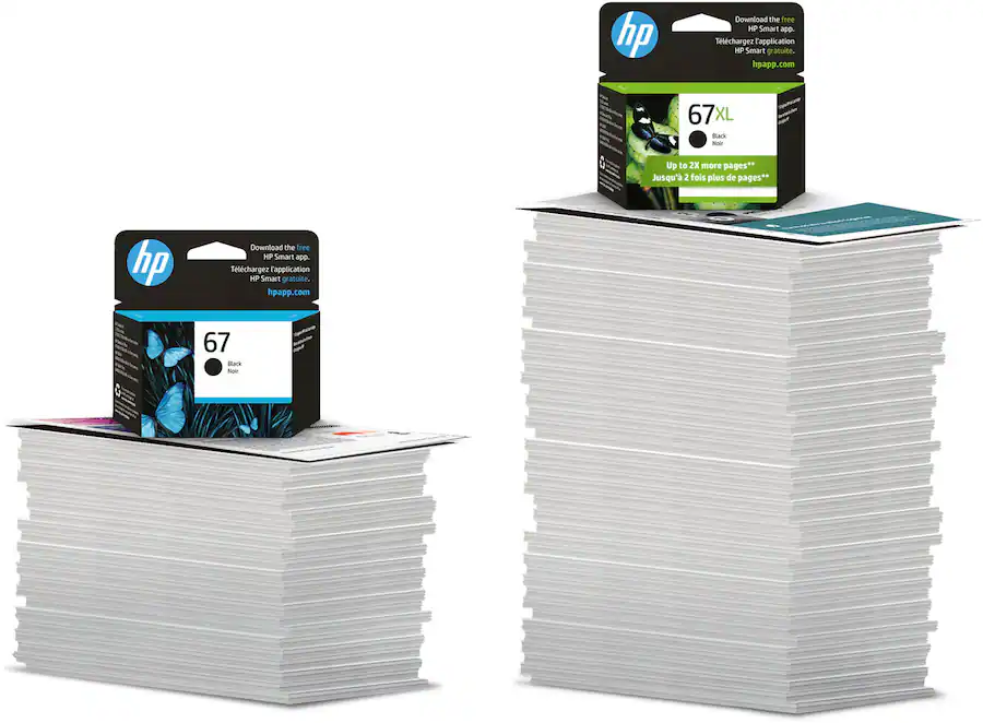 The 67 2-Pack Standard Capacity Ink Cartridges includes one black and one tri-color cartridge, providing reliable, high-quality printing for select Deskjet, Envy, and DeskJet Plus printers.