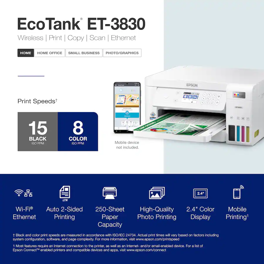 Supports Ethernet and wireless connections, hands-free voice printing, and easy mobile printing through a companion app.