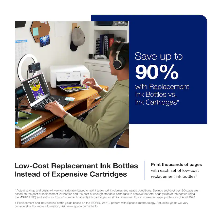 Cut your ink costs by up to 90% compared to traditional cartridges. One set of replacement bottles can print up to 4,500 black and 7,500 color pages, letting you print freely without worrying about running out.