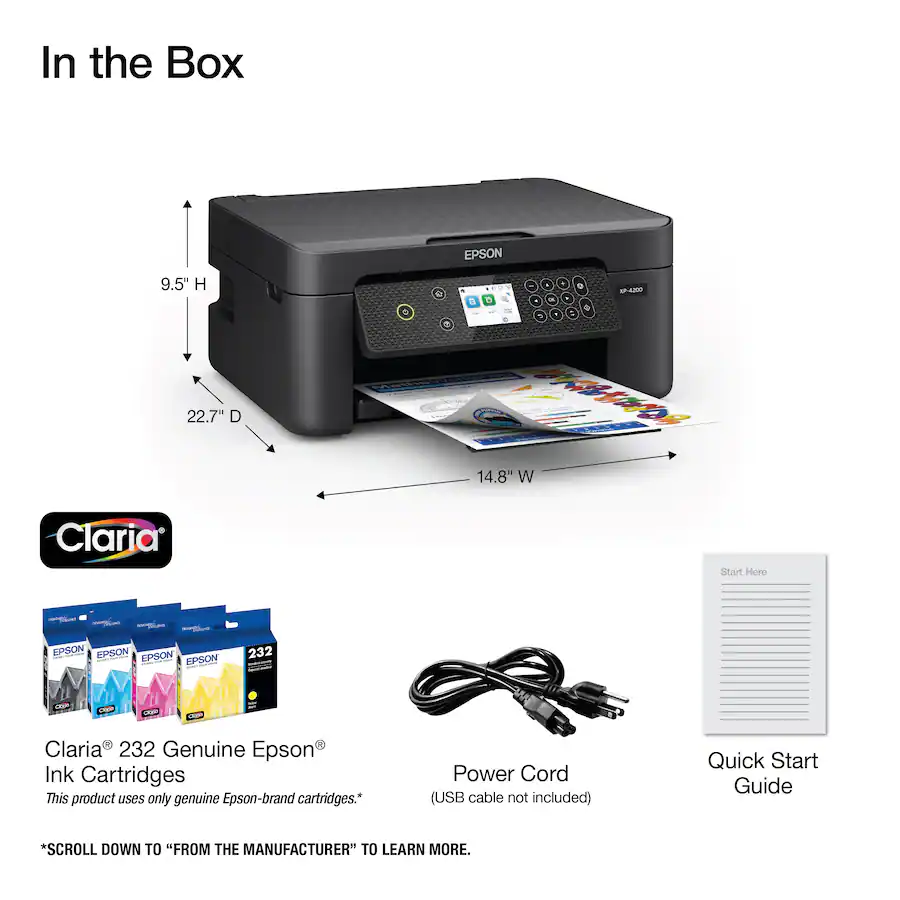 Simplify your everyday printing with the HomePrint XP-4200 — a reliable all-in-one printer built for home and creative use. From school projects and recipes to borderless photo prints, it delivers crisp, vibrant results every time. With effortless setup, intuitive navigation via a 2.4” color display, and wireless printing from any smartphone or tablet, this compact printer makes home printing easy and efficient.