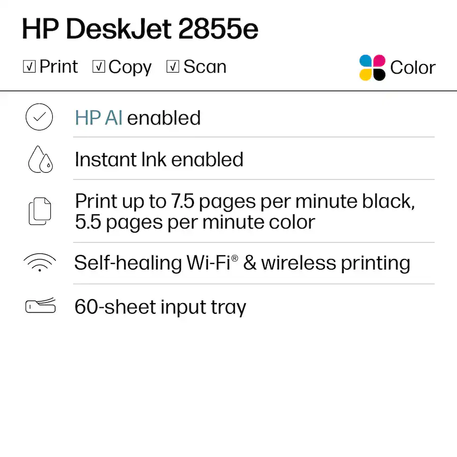 Bring smart printing into your home with the SmartJet 2855e, a compact and intelligent all-in-one printer designed for modern households. It combines printing, scanning, and copying in one sleek device with wireless connectivity and AI-powered optimization for seamless performance. With a 60-sheet paper tray, simple setup, and energy-efficient design, it makes everyday printing effortless. Perfect for to-do lists, letters, photos, and documents, the SmartJet 2855e delivers reliable results while helping you save time and ink.